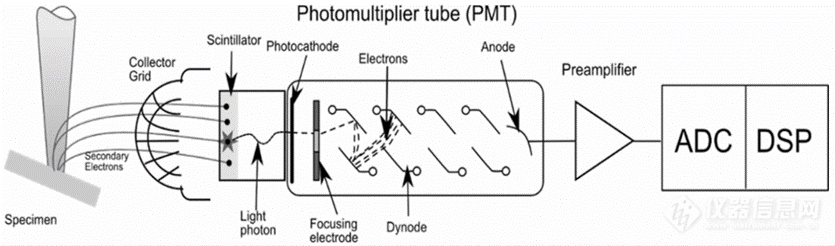 闪烁体相比半导体式的固体背散射电子探测器来说,拥有更好的灵敏度、信噪比和更低的能带宽度,见图3-35。