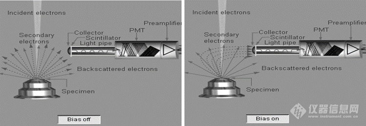 二次电子能量较小,很容易受到其它电场的影响而产生偏转,利用二次电子的这个特性可以对它进行区分和收集,如图3-25。在探测器的前端有一个金属网(称为法拉第笼),当它加上电压之前,SE向四周散射,只有朝向探测器方向的少部分SE会被接收到;当金属纱网加上+250V~350V的电压时,各个方向散射的二次电子都受到电场的吸引而改变原来的轨迹,这样大部分的二次电子都能被探测器所接收。