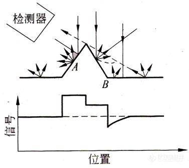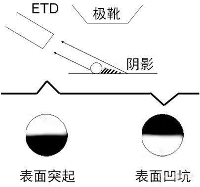 ETD由于在极靴的一侧,而非全部环形对称,这样的几何位置也决定了其成像有一些特点,比如会产生较强的阴影效应。ETD通过加电场来改变SE的轨迹,而当样品表面凹凸较大,背向探测器的“阴面”所产生的二次电子的轨迹不足以绕过试样而最终被试样所吸收。在这些区域,探测器采集不到电子信号,而最终在图像上呈现更暗的灰度。而在朝向探测器的阳面,产生的信号没有任何遮挡,呈现出更亮灰度,这就是阴影效应。如图3-28,A和B区域倾斜度相同,按照倾斜角和产额的理论两者的二次电子产额相同。但是A区域的电子可被探测器无遮挡接收,而B区域则有一部分电子要被试样隆起的部分吸收掉,从而造成ETD实际收集到的电子产额不同,显示在图像上明暗不同。