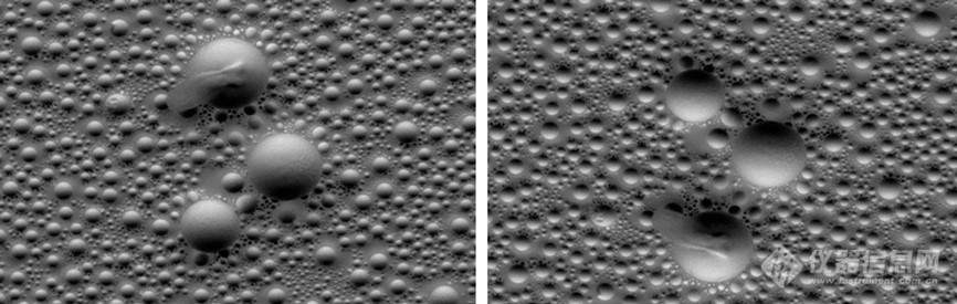 阴影效应既是优点也是缺点,阴影效应给图像形成了强烈的立体感,但有时也会使得我们对一些衬度和形貌难以做出准确的判断。如图3-29,左右两者图仅仅是图像旋转了180度,但试样表面究竟是球形凸起还是凹坑,一时难以判断,可能会给人视觉上的错觉。