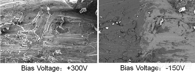 在以前很多地方都把ETD称之为SE检测器,这种叫法其实不完全正确。ETD除了能使得SE偏转而接收二次电子,也能接收原来就向探测器方向散射的背散射电子。所以在加上正偏压的情况下,ETD接收到的是SE和BSE的混合电子。据一些报道称,其中BSE约占10-15%左右。如果将ETD的偏压调小,探测器吸引SE的能力变弱,而对BSE几乎没有什么影响。所以可以通过改变ETD的偏压来调节其接收到的SE和BSE的比例。如果将ETD的偏压改为较大的负电压,由于SE的能量小于50eV,受到电场的斥力,不能达到探测器位置,而朝向探测器方向散射的BSE因为能量较高不易受电场影响而被探测器接收,此时ETD接收到的完全是背散射电子信号。如图3-31,铜包铝导线截面试样在ETD偏压不同下的图像,左图主要为SE,呈现更多的形貌衬度;右图全部BSE,呈现更多的成分衬度。
