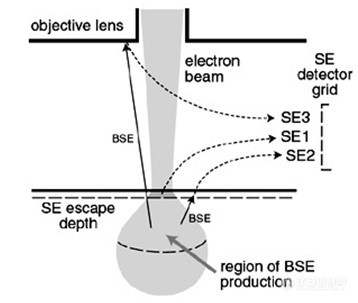 此外,ETD能接收到的信号相对比较杂乱,除了我们希望的SE1外,还接收了到了SE2、SE3和BSE,如图3-32。而后面三种相对来说分辨率都较SE1低很多,尤其SE3,更是无用的背底信号,这也使得ETD的分辨率相对其它镜筒内探测器来说要偏低。