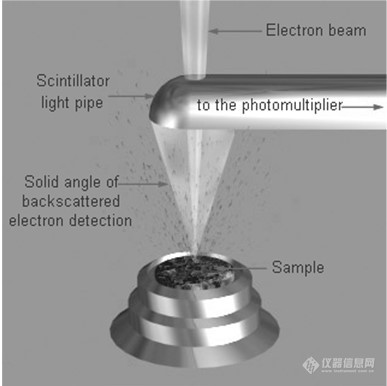 极靴下固体背散射电子探测器除了使用半导体材质外,还有使用闪烁体晶体的,比如YAG晶体。闪烁体型的工作原理和半导体式类似,如图3-36。能量低的二次电子达到背散射电子探测器后不会有任何反应,而能量高的背散射电子却能引起闪烁体的发光。产生的光经过光导管后,在经过光电倍增管,信号经过放大和调制后转变为BSE图像。