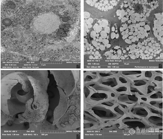 特别是在2015年03月,TESCAN推出了最新的闪烁体背散射电子探测器LE-BSE,更是将灵敏度推向到200V的新高度,可以在200V的超低电压下直接进行BSE成像。因为现在低电压成像越来越受到重视和应用,但是以往只是针对SE图像;而现在BSE图像也实现了超低电压下的高分辨成像,尤其对生命科学有极大的帮助,如图3-37。