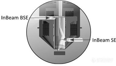 前面已经说到ETD因为接收到SE1、SE2、SE3和部分BSE信号,所以分辨率相对较低,为了进一步提高电镜的分辨率,各个厂商都开发了镜筒内电子探测器。由于特殊的几何关系,降低分辨率的SE2、SE3和低角BSE无法进入镜筒内部,只有分辨率高的SE1和高角BSE才能进入镜筒,因此镜筒内的电子探测器相对镜筒外探测器分辨率有了较大的提高。