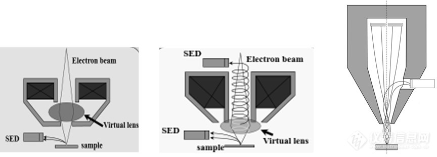 图3-39 常规无磁场物镜和ETD(左)、半浸没式物镜和镜筒内探测器(中、右)