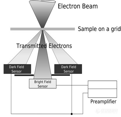 当样品很薄的时候,电子束可以穿透样品形成透射电子,因此只要在样品下方放置一个探测器就能接收到透射电子信号。