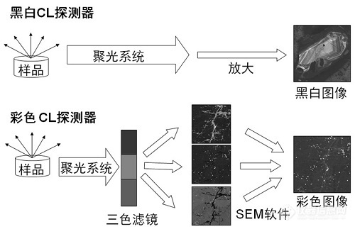 黑白荧光和彩色荧光和黑白胶片及数码彩色CCD原理极其类似。一般单色型探测器由于不需要滤镜,所以有着比彩色型更好的灵敏度;而彩色型区分波长,有着更丰富的信息。为了结合两者的优势,TESCAN又开发了特有的Rainbow CL探测器。在普通彩色荧光探测器的基础上增加了一个无需滤镜的通道,具有四通道,将单色型和彩色型整合在了一起,兼顾了灵敏度和信息量。