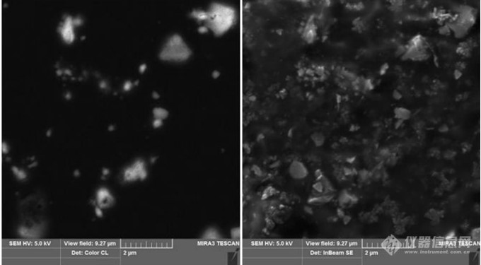 图3-44含CRY18(蓝)和YAG-Ce(黄)的阴极荧光(左)与二次电子(右)图像
