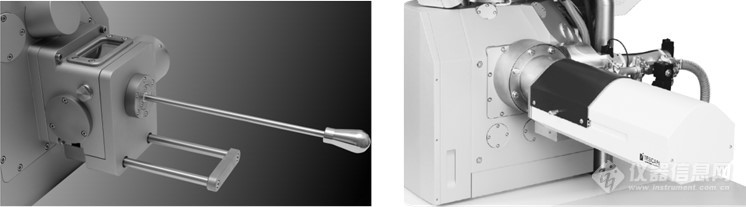 而对于样品室的真空度,钨灯丝和欧美系热场的要求将对较低,一般优于2×10-2Pa即可开启电子枪,所以换样抽真空的时间比较短;而日系热场电镜或者冷场电镜则要达到更高的线Pa才能开启电子枪。为了保证换样时间,日系电镜一般都需要额外的交换室,在换样的时候,利用交换室进行,不破坏样品室的真空。而欧美系电镜普遍采用抽屉式大开门的样品室设计。两种设计各有利弊,抽屉式设计一般样品室较大,可以放置更大更多的样品,效率高。或者对于有些特殊的原位观察要求,大开门设计才可能放进各种体积较大的功能样品台,如加热台、拉伸台;交换室相对来说更有利于保护样品室的洁净度,减少污染。不过大开门式设计也可以加装交换室,如图3-46,达到相同的效果,自由度更高。