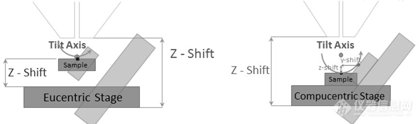 样品台一般又有真中央样品台和优中心样品台之分。样品台在进行倾转时都有一个倾转中心,样品台绕该中心进行倾转。如果样品观察的位置恰好处于倾转中心,那么倾转之后电镜的视场不变;但如果样品不在倾转中心,倾转后视场将会发生较大变化。特别是在做FIB切割或者EBSD时,样品需要经过五十几度和七十度左右的大角度倾转,电镜视场变化太大,往往会找不到原来的观察区域。在大角度倾转的情况下如果进行移动的话,此时样品会在高度方向上也发生移动,不注意容易碰撞到极靴或者其它探测器造成故障,这对操作者来说是危险之举。而优中心样品台则不一样,只要将电子束合焦好,电镜会准确的知道观察区域离极靴的距离,在倾转后观察区域偏离后,样品台能自动进行Y方向的平移进行补偿,保持观察的视野不变,如图3-47。