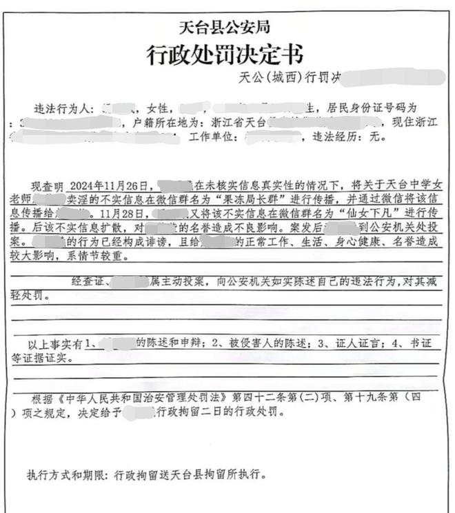 张女士是浙江某地的一名中学教师。天台县公安局于2024年12月24日作出的行政处罚决定书显示,当年11月26日,张女士在未核实信息真实性的情况下,将关于天台县某中学女老师申某某卖淫的不实信息在“果冻局长群”进行传播,并通过微信将该信息传播给郑某某。11月28日,张女士又将该信息在微信群“仙女下凡”进行传播。后该不实信息扩散,对申某某的名誉造成不良影响。