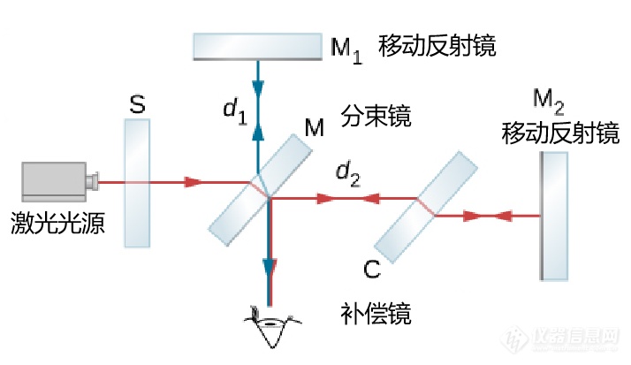真正促进干涉技术巨大进步的契机是1960年激光器的发明。激光由于具有极窄的谱线,因而具有非常优秀的空间相干性。目前激光干涉仪主要的用途包括精准的尺寸和移动距离测量,测量准确度最高可以达到纳米甚至亚纳米量级。在构成上激光干涉仪最常使用的波长为632.8 nm,对于经典的迈克尔逊干涉测量原理,由激光器中出射的单色激光经过50:50半透半反的分束镜后分为2束光束,其中一束经过固定的光程后被反射镜反射,称为参考光束;另外一束光束由于存在被测对象,被反射镜反射后光程发生改变(距离或折射率变化引起),称为测量光束。当两束光被反射后在分束镜第二次合成并随后照射探测器上被接收后,将产生干涉条纹的移动。由之前的光波的叠加性可知,假设测量光路距离变化为316.4 nm,当只存在一去程一回程的情况下,此时干涉条纹相位变化2π。目前商用激光干涉仪普遍采用两去程两回程,同时采用1024倍电子细分卡,因此分辨率可达0.16 nm。
